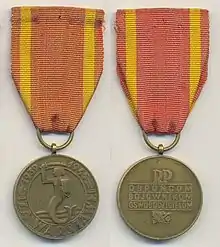 The Medal for Warsaw 1939–1945 (Polish: Medal za Warszawę 1939–1945) was a Polish commemorative medal awarded by the Polish People's Republic to commemorate active participation in defending Warsaw in 1939, 1944 Warsaw Uprising, and in liberation of Warsaw from Nazi Germany in January 1945.[1]