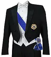 A special and rarely granted award, called the Presidential Medal of Freedom with Distinction,[12] has a larger version of the same badge, which is worn as a star on the left chest. It comes with a sash that is worn over the right shoulder (similarly to the Grand Cross of an order of chivalry), with its rosette (blue with a white edge, bearing the central disc of the badge at its center) resting on the left hip. When the medal with Distinction is awarded, the star may be presented hanging from a neck ribbon and can be identified by its size, which is larger than the standard badge.