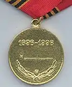 The medal's original reverse, as mandated by Decree of the President of the Russian Federation of March 6, 1995 No 243,[6] bore at its center the large relief years "1896 - 1996" and oak and laurel branches at the bottom following the medal's lower circumference. Some makers produced a variant of the medal with a smaller inscription (1896 - 1996) and added a relief "N" and a line for an award serial number. More than 2.5 million were awarded.