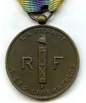 The Medal of a liberated France (French: "Médaille de la France libérée") was a decoration of the French Republic created by decree on 12 September 1947 and originally named the "Medal of Gratitude of a Liberated France" (French: "Médaille de la Reconnaissance de la France Libérée").[2] It was intended as a reward for French and foreign nationals that had made a notable contribution to the liberation of France from the German occupation.