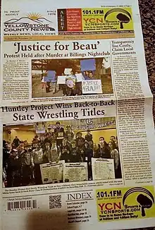 The Yellowstone County News is a weekly newspaper which was first published in 1977 by Dale Oberly and Rebecca Oberly of Pioneer Publishing Company.[4] It covers a wide variety of topics and issues each week including news from the Yellowstone County Commissioners and other public government meetings, as well as hyperlocal news pertaining to the geographic area of Yellowstone County.[5] It was owned by Pete Robison and Rebecca Tescher-Robison from 1993 to 2014. In 2014, Yellowstone County News was purchased by Jonathan McNiven and Tana McNiven, who own and operate the newspaper currently.[6]