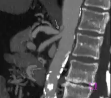 In medicine, the median arcuate ligament syndrome (MALS, also known as celiac artery compression syndrome, celiac axis syndrome, celiac trunk compression syndrome or Dunbar syndrome) is a rare[1] condition characterized by abdominal pain attributed to compression of the celiac artery and the celiac ganglia by the median arcuate ligament.[2] The abdominal pain may be related to meals, may be accompanied by weight loss, and may be associated with an abdominal bruit heard by a clinician.