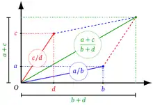 Two points where are two representations of (possibly equivalent) rational numbers and . The line segments connecting the origin of coordinates to and form two adjacent sides in a parallelogram. The vertex of the parallelogram opposite to the origin of coordinates is the point , which is the mediant of and .