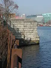 The initiative group consists of the pragmatically oriented AG Spreeufer[34] and the rather radical left-wing AG SpreepiratInnen.[35] The group sees itself as a lobbyist for those who want the Spree riverfront to be a green space and a cultural space with varied uses. Their principal demands call for a minimum distance of 50 m (160 ft) for all new buildings, the adherence to Berlin's building height of 22 m (72 ft), and a pedestrian/cyclist bridge rather than a street bridge. Furthermore, existing buildings should be integrated to an open-space concept and supplemented by pavilions for public use. The remaining land available for construction should be parceled out in such a way as to not only reduce the number of large property investors, but also to facilitate the engagement of other users—especially non-commercial, cultural initiatives. The initiative group also accuses the district of privatizing public property.[36]