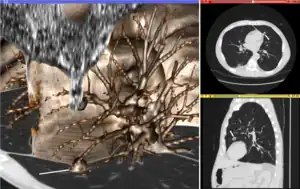Volume rendering (left), axial cross-section (right top), and sagittal cross-section (right bottom) of a CT image of a subject with multiple nodular lesions (white line) in the lung.