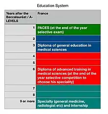 - Two years on internship, in which the student is a physician but under the supervision of the chief doctor; the student rotates over the major and most essential specialties during period of four months each. After that, student has the choice of either passing the residency national exam or extending his internship for another year, after which he gains the status of family physician.[10][11] The residency program consists of four to five years in the specialty he qualifies, depending on his score in the national residency examination under the rule of highest score chooses first. Whether the student chooses to be a family doctor or a specialist, he has to make a doctorate thesis, which he will be defending in front of a jury, after which he gains his degree of Doctor of Medicine (MD).