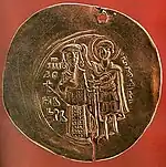 - Fifth type: Obverse - Virgin Mary Hagioritissa; reverse - the Emperor upright holding a scepter in his right hand. Weight - 3,04 g; diameter - 26,25 mm. There are few preserved coins of that type.