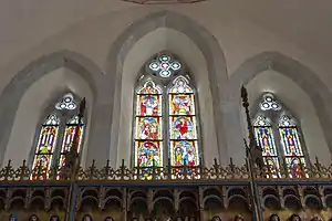 The oldest stained glass windows preserved in situ in Sweden are found in Dalhem Church on Gotland.[26] Five of the thirteen window panes in the eastern choir window are original; the rest date from a restoration done in a medieval revival style 1899–1914.[27] Each window pane is approximately 50 centimetres (20 in) by 60 centimetres (24 in) large.[28] These five windows probably date from c. 1230–1250; a somewhat later window in one of the northern choir walls (c. 1250–1280) show similar stylistic traits. These early works are characterised by an influence from Byzantine art. Stylistically related works can be found in Western Germany, particularly Westphalia, and notably in St. Elizabeth's Church, Marburg.[27][28][29] Comparisons have also been made with windows in Barfüßerkirche[30] in Erfurt and Neukloster monastery.[25] The Byzantine influence, as seen e.g. in the representation of Christ Pantocrator in Dalhem, thus probably arrived with craftsmen from western Germany, who are also known to have been active as tradesmen on the island at this time. A clearly Western element in the aforementioned representation of Christ is thus e.g. the cross flag that Christ holds.[31] Roosval also notes that a particular way of depicting the hair of Christ can be seen in the window in Dalhem, in Marburg and in the Byzantine mosaics in Cefalù Cathedral on Sicily; his conclusion is that the stylistic influence from Sicily may have reached Germany perhaps via the court of Emperor Frederick II, and from Germany to Gotland.[32] Apart from Dalhem, window panes of broadly the same style and age are also known from Atlingbo, Barlingbo, Eksta, Endre, Lojsta, Rone, Sjonhem and Väskinde churches.[33]
