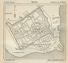 According to the inscriptions at the facade of the great mosque, the medina of Sfax was founded following the orders of the Aghlabid emir (prince) of Kairouan Abu Abbass Muhammad in 849, by Ali Ibn Salem, cadi of Sfax.[1] In fact, in the middle of the ninth century, the Aghlabids who used to rule Ifrikia agreed on supporting the city's shores with forts and trusses, that's when Borj Sfax or Kasbah of Sfax was built as one of the forts, but as time passed and life evolved around it the Aghlabid decided to build the city of Sfax.[2]