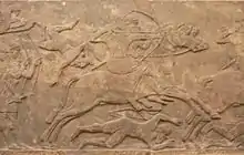 The photograph above left shows Assyrian cavalry from reliefs of 865–860 BC. At this time, the men had no spurs, saddles, saddle cloths, or stirrups. Fighting from the back of a horse was much more difficult than mere riding. The cavalry acted in pairs; the reins of the mounted archer were controlled by his neighbour's hand. Even at this early time, cavalry used swords, shields, spears, and bows. The sculpture implies two types of cavalry, but this might be a simplification by the artist. Later images of Assyrian cavalry show saddle cloths as primitive saddles, allowing each archer to control his own horse.[7]