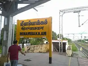 Meenambakkam Railway Station is one of the railway stations of the Chennai Beach–Chengalpet section of the Chennai Suburban Railway Network. It serves the neighbourhood of Meenambakkam, a suburb of Chennai. It is situated at Grand Trunk Road across Chennai International Airport Cargo Terminal, with an elevation of 18 m (59 ft) above sea level.[1]