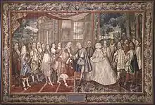The meeting was later (by about 1660) depicted in a tapestry in a series on the life of Louis XIV, designed by Charles Le Brun, an example of which is in the Palace of Versailles. Another set of copies of this is now in the French Embassy in Madrid.[1][3] This composition was later copied in oils by Jacques Laumosnier (Musée de Tessé, Le Mans).[4]