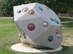 Mega-Gem is an outdoor sculpture by American artist John Francis Torreano (born 1941). It is located on the Indiana University-Purdue University Indianapolis (IUPUI) campus, which is near downtown Indianapolis, Indiana, and is owned by the Indianapolis Museum of Art. The oversized sculpture, made of aluminum, is shaped like a round-cut diamond resting on one its facets and studded with 36 smaller, colored-metal rosettes.