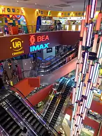 MegaBox incorporates a concept the mall refers to as "Totally Connected Modules" (TCM),[4] which is purportedly realized in three ways: the free-flow of visitor traffic, facilitated by express escalators and elevators connecting the mall's four major zones; second, through the access driveway reaching all floors; and third, the mall's connectivity with the outside environment through its L5 and Beehive Atriums, both incorporating six-storey glass curtain wall for views natural light.