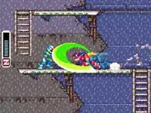When available, each of the player's four weapons can be charged up for a more powerful attack. Moreover, the player can level-up weapons with prolonged use of them.[6] Depending on the weapon, leveling one up will allow for more attacks, increased attack range, or shortened charge time. In previous Mega Man games, the player would obtain new weapons from defeated bosses and could in turn use those weapons against other bosses and minor enemies. In Mega Man Zero, defeating some bosses earns the player elemental chips (thunder, fire, or ice) that can be used during a charged attack to further damage foes weak to a specific element.[13][14] Mega Man Zero also introduces "Cyber Elves", which can be found hidden in certain missions or dropped by enemies. Cyber Elves are collectible, single-use aids with either temporary or permanent effects on Zero or the game's levels.[4][7] Cyber Elf effects range widely, from reducing the life gauge of a boss to slowing down all enemies in a stage.[6][15] Up to three Cyber Elves can be equipped for a given level and some can only be activated once they are fed sufficient energy crystals picked up or collected from defeated enemies.[4][5][14] The player's performance is scored on a percentage scale and graded at the end of each mission. The results are based on parameters including the completion time, the number of enemies destroyed, and the player's total damage.[14]