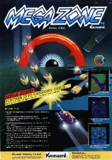 Mega Zone is an overhead vertically scrolling shooter released as an arcade video game by Konami in 1983. Mega Zone is similar to Xevious, where the player flies over a landscape of rivers and trees and futuristic enemy emplacements. There are both aerial and ground targets, but unlike Xevious both can be destroyed with the same weapon. At certain points the player can choose either the left or right fork of a branching path.[4]
