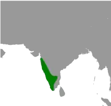 The main range is along the Western Ghats south from the Surat Dangs and along the associated hills of southern India into parts of the southern Eastern Ghats mainly in the Shevaroy and Chitteri Hills.[11][9] In some areas such as in the city of Bangalore, it has been suggested that this species may have displaced the brown-headed barbet which was once said to occur there.[12]
