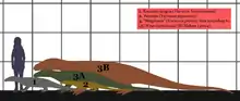 The lack of complete or nearly complete fossil skeletons has made it difficult to determine the exact dimensions of megalania.[7] Early estimates placed the length of the largest individuals at 7 m (23 ft), with a maximum weight of approximately 600–620 kg (1,320–1,370 lb).[11] In 2002, Stephen Wroe considerably downsized megalania, suggesting a maximum length of 4.5 m (15 ft) and a weight of 331 kg (730 lb) with averages of 3.5 m (11 ft) and 97–158 kg (214–348 lb),[12] decrying the earlier maximum length estimate of 7 m (23 ft) as exaggerations based on flawed methods. In 2009, however Wroe joined other researchers in raising the estimate to at least 5.5 m (18 ft) and 575 kg (1,268 lb).[13]