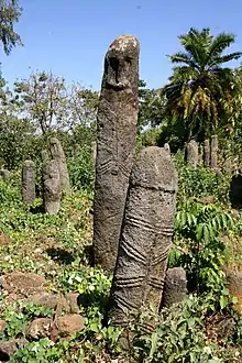 Stelae are a type of megaliths found in central, south and southwestern Ethiopia. Several stelae sites have been discovered in the southern part of Ethiopia. In the 1920s Azais studied some of the megalithic sites of located in Gedeo zones and Sidama zones.[11] A significant number of stelae sites are identified in other areas of the southern region. Anfray and Joussaume reported several stelae sites from Gurage, Silti, Hadiya, Kambata and Wolayita. The stelae are commonly named as Ya Gragn Dingay (literary the stone of Gragn).[13][14] The total number of stelae in the southern region was estimated at ten thousand. The southern region is known for the huge concentration of megalithic culture. Due to this the region is referred to as “stelae belt”.[18]