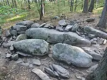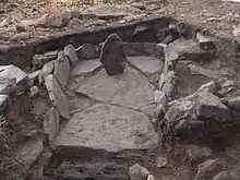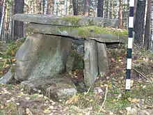 At present, more than 200 dolmens have been discovered in the Sverdlovsk Oblast.[1][2] Specificity of the dolmens in the Middle Urals is their relatively small size (width and length no more than 1.5 - 2.5 m) and original constructions. Based on differences in their construction, it is possible to distinguish two main types of dolmen:
