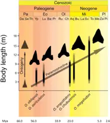 Another model of the evolution of this genus, also proposed by Casier in 1960, is that the direct ancestor of the Carcharocles is the shark Otodus obliquus, which lived from the Paleocene through the Miocene epochs, 60 to 13 Mya.[23][26] The genus Otodus is ultimately derived from Cretolamna, a shark from the Cretaceous period.[6][28] In this model, O. obliquus evolved into O. aksuaticus, which evolved into C. auriculatus, and then into C. angustidens, and then into C. chubutensis, and then finally into C. megalodon.