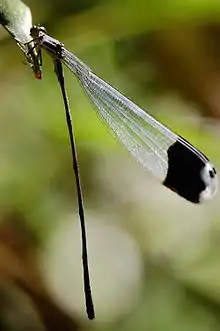 As with other damselflies, the young—known as naiads, nymphs, or larvae—are carnivorous. The most ubiquitous prey in the tree holes they inhabit are mosquito larvae, but they will also feed on tadpoles, syrphid fly and chironomid fly larvae, and other odonate (dragonfly and damselfly) naiads.[3] The three leaflike caudal lamellae at the end of the abdomen, which serve as gills, are broad and elaborately folded, an adaptation to intermittent low oxygen availability in its habitat.[4] Each lamella has a conspicuous white spot, making Megaloprepus easy to distinguish from other tree-hole damselflies.[5]