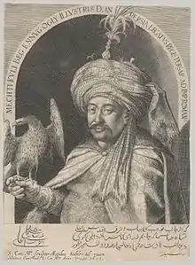 ![]() Mehdi Qoli Beg's portrait, engraved by Aegidius Sadeler II in 1605 | |