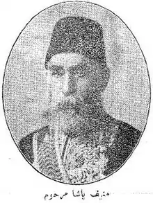 Mehmed Tahir Münif Pasha (1828-1910) was an Ottoman writer and statesman. A veteran official, he served thrice as Minister of Education (1877; 1878–1880 and 1885–1891) and twice as ambassador to Qajar Iran (1872–1877, and 1896–1897). During his first ambassadorship to Iran, he was awarded the Order of the Lion and the Sun medal. He also served as a trusted advisor to Sultan Abdul Hamid II, until he fell out of grace.[1]