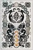 The first notes adopted and released by the Japanese government are part of a series known as Meiji Tsūhō (明治通宝). These notes were the first Japanese currency ever to be printed using western printing at Dondorf and Naumann, which was located in Frankfurt.[1] Meiji Tsuho notes were designed by Edoardo Chiossone sometime in 1870 while he was working for Dondorf Naumann on behalf of The National Bank in the Kingdom of Italy.[2] The process of making Chiossone's proposed design a reality started with the establishment of the "Imperial Printing Bureau of Japan" in 1871 (4th year of Meiji). In order to produce the currency the Japanese government reached out to Dondorf and Naumann to gain access to Western technology.[2] Chiossone had a falling out with Italian Bank as his relationship with them had hit a breaking point. When the company suggested Chiossone for the role as engraver, he quickly accepted the offer.[2] The production of money was handed over to the Imperial Printing Bureau in January 1872 when banknotes began to arrive from Germany.[3] All of these arrivals were purposely left incomplete due to security reasons, as the words "Meiji Tsuho" and the mark of the Minister of Finance were added in Japan by the Imperial Printing Bureau.[4] Dondorf and Naumann eventually sold their printing equipment to the Japanese government towards the end of 1873 (6th year of Meiji) due to financial issues. The original drawings of Meiji Tsuho were given to Japan in the following year, and engineers were hired for technical guidance. Production of Meiji Tsuho notes were this shifted to domestic production for the rest of their issuance. These notes feature an elaborate design that was difficult to forge at the time as counterfeiting was previously rampant with clan notes.[5]