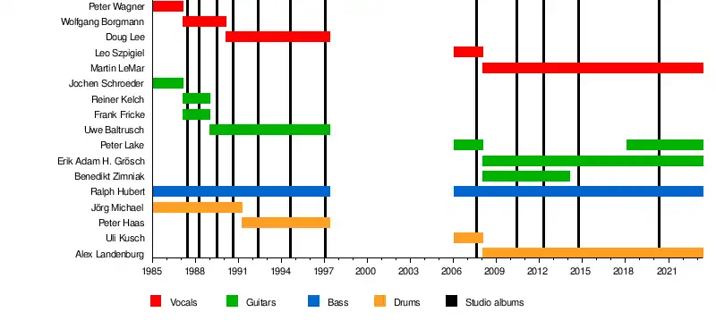 | Past members | Wolfgang Borgmann Jochen Schroeder Frank Fricke Reiner Kelch Georg Syrmbos Peter "Peavy" Wagner Jörg Michael Uli Kusch Peter Haas Doug Lee Uwe Baltrusch Leo Szpigiel Benedikt Zimniak |
