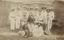 from left to right: Lieutenant Francis Garnier, Lieutenant Louis Delaporte, Clovis Thorel, Captain Ernest Doudart de Lagrée, Lucien Joubert and Louis de Carné - engraving from photo by Émile Gsell
