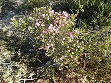 The flowers are arranged in heads at the ends of branches, with the branch continuing to grow after flowering. Each head has 1 to 4 groups of flowers in pairs or threes. The stamens are arranged in five bundles around each flower, 6 to 12 stamens per bundle, coloured pink, purple or magenta. Flowering occurs in September and October and the fruit which follow are woody capsules 4.8–6.5 mm (0.2–0.3 in) long.[2][3]