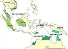 Melaleuca cajuputi subsp. cajuputi occurs in the Dampier Peninsula, Calder River, Fitzroy Crossing district in the Central Kimberley biogeographic zone in Western Australia,[9] the northern part of the Northern Territory, and East Timor. It grows in woodland, vine forest, gallery forest and savannah forest, on clayey and peaty loam.[3]