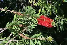 Melaleuca citrina, the common red bottlebrush, crimson bottlebrush, or lemon bottlebrush,[3] is a plant in the myrtle family Myrtaceae, and is endemic to eastern Australia. Some Australian state herbaria continue to use the name Callistemon citrinus.[4] It is a hardy and adaptable species, common in its natural habitat. It is widely cultivated, not only in Australia. It was one of the first Australian plants to be grown outside the country, having been taken to England in 1770 by Joseph Banks. Its showy red flower spikes, present over most of the year in an ideal situation, account for its popularity.