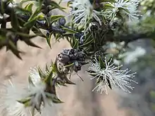 The plant flowers profusely but the white or cream-coloured flowers occur singly within the foliage of the shrub and are sweetly scented.[4] The petals are 2.2–2.8 mm (0.087–0.11 in) long and fall off as the flower opens. The stamens are in five bundles around the flower, each bundle containing 8 to 13 stamens. (In Melaleuca podiocarpa there are 30 to 45 stamens per bundle.) The main flowering season is in September and the fruit which follow are woody capsules 4–5 mm (0.16–0.20 in) long.[2][3]