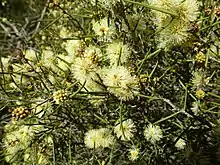 The flowers are arranged in heads 10–15 mm (0.4–0.6 in) across on the ends of the branches and in leaf axils, each head containing 4 to 18 groups of three flowers. The flowers are cream to white or yellow with petals that fall off as the flower opens or soon after. The stamens are arranged in five bundles around the flower, each bundle containing 3 to 9 stamens. Flowering occurs from August to November, mainly October and November and the fruit that follow are woody capsules in tight, almost spherical clusters up to 9.8 mm (0.4 in) in diameter and each fruit about 2–4 mm (0.08–0.2 in) in diameter.[2][3][4]