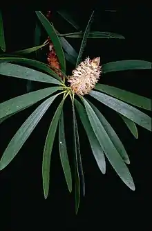 The flowers occur on a spike, usually at the end the branches which continue to grow after the flowering period. The flowers open in succession from the bottom end of the spike which contains 10 to 50 groups of flowers in threes. The petals are 1.9–2.2 mm (0.075–0.087 in) long and fall off as the flowers open and the white stamens are arranged in five bundles around the flower, each bundle containing 5 or 6 stamens. Flowering occurs during summer and is followed by fruit which are as woody capsules, each about 3.4 mm (0.13 in) long.[2][3]