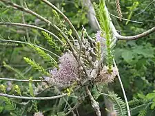 The flowers are a shade of pink or purple but fade rapidly to white. They are arranged in spikes on the ends of branches which continue to grow after flowering and on the sides of the branches. The spikes are up to 16 mm (0.6 in) in diameter, 20–30 mm (0.8–1 in) long and have between 6 and 22 individual flowers. The petals are 1.8–2.3 mm (0.07–0.09 in) long and fall off as the flower ages. The stamens are arranged in five bundles around the flowers with 12 to 26 stamens in each bundle. The flowering season is from August to May but flowers mostly appear from November to February in the species' native range. The fruit which follow are woody capsules, characteristically fused together at their bases and sunken in the stem.[2][3][4]