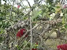 The flowers are arranged in spikes on the sides of the branches, each spike up to 65 mm (3 in) in diameter and 80 mm (3 in) long and containing 20 to 60 individual flowers. The flowers range in colour from the more usual dark red through to pinkish-cream and appear over a long period from as early as August to as late as April. The petals are papery brown, 4.2–6.3 mm (0.2–0.2 in) long and fall off as the flowers age. The stamens are arranged in bundles of five around the flower, with 12 to 33 stamens in each bundle. The fruit are woody capsules, 4.8–6.2 mm (0.2–0.2 in) long and 8 mm (0.31 in) in diameter and form cylindrical clusters along the stem.[3][4]