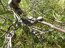 The flowers are a shade of red, pink or white and are arranged in spikes on the sides of the branches. The spikes are up to 75 mm (3 in) in diameter and contain 6 to 20 individual flowers arranged in a decussate pattern. The stamens are arranged in five bundles around the flower, each bundle at least 20 mm (0.8 in) long and containing 22 to 80 stamens. The flowers appear from late winter to summer (July to December) and are followed by fruit which are woody capsules 4.2–7.2 mm (0.2–0.3 in) long, shaped like a squashed urn and arranged in alternating pairs along the stems.[3][4]