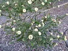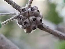 The flowers are arranged in hemispherical heads, mostly on the ends of branches which continue to grow after flowering. Papery brown, overlapping bracts surround the flower buds and remain under the open flowers. The filaments of the stamens are white but the anthers on their ends are yellow or cream coloured, giving the appearance of pale yellow flowers. The heads contain 4 to 12 groups of flowers in threes and are up to 50 mm (2 in) wide. The petals are 3–5 mm (0.1–0.2 in) long and fall off as the flower matures. The stamens are arranged in five bundles around the flower, each bundle usually containing 12 to 16 stamens. Flowering occurs from June to November but mainly in early spring and the fruit which follow are woody, cup shaped capsules 4.5–7 mm (0.2–0.3 in) long that are clustered along the stem.[2][3][4]