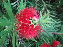 The flowers are a shade of red to crimson and arranged in spikes on the sides of the branches. The spikes are 15–65 mm (0.6–3 in) in diameter with 15 to 30 individual flowers. The petals are 4.2–6.2 mm (0.17–0.24 in) long, densely hairy on the outer surface and fall off as the flower ages. There are 27 to 47 stamens in each flower. Flowering occurs in spring and summer but sometimes at other times of the year. Flowering is followed by fruit that are woody capsules, 6.2–8.6 mm (0.2–0.3 in) long.[3][4]