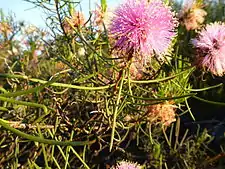 The flowers are a shade of pink to purple and are arranged in heads on the ends of most of the branches, which continue to grow after flowering. The heads are up to 55 mm (2 in) in diameter but more usually about half that size, and contain 10 to 20 groups of flowers in threes. The stamens are in five bundles around the flower, each bundle with 7 to 13 stamens. Flowering usually occurs in September or October and the fruit which follow are woody capsules 3–6 mm (0.1–0.2 in) long in roughly spherical clusters along the stems.[2][3]