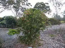 The flowers are bright red and are arranged in spikes on the ends of branches that continue to grow after flowering and sometimes in the upper leaf axils. The spikes are 50–60 mm (2.0–2.4 in) in diameter. The petals are 3.6–5.3 mm (0.1–0.2 in) long, fall off as the flower ages and there are 35-50 stamens in each flower. Flowering occurs from late winter to summer, sometimes in other months and is followed by fruit that are woody capsules, 4.6–6.5 mm (0.2–0.3 in) long.[3][4]