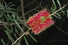 Melaleuca rugulosa, commonly known as scarlet bottlebrush, is a plant in the myrtle family, Myrtaceae and is endemic to South Australia and Victoria in Australia. (Some Australian state herbaria continue to use the name Callistemon rugulosus.[2] Callistemon coccineus and Callistemon macropunctatus are older names for Callistemon rugulosus.[3][4]) It is a shrub with an open straggly habit, stiff, sharply pointed leaves and bright red bottlebrush flowers tipped with yellow in summer.