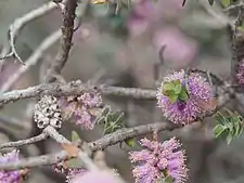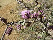 The flowers are a shade of pink to purple and are arranged in short spikes on the sides of the branches. Each spike contains 3 to 29 individual flowers and is up to 20 mm (0.79 in) in diameter. The petals are 2.4–3.1 mm (0.09–0.1 in) long and fall off as the flowers mature. The stamens are arranged in five bundles around the flowers and there are 9 to 16 stamens per bundle. The flowering period is in September or October and is followed by fruit which are woody capsules 5–6 mm (0.2–0.2 in) long with teeth around the edges and in clusters along the branches.[2][3][4]