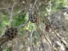 The flowers are yellow to white and arranged in heads or short spikes on the sides of the branches. Each head contains 4 to 13 groups of flowers in threes and is up to 15–17 mm (0.6–0.7 in) in diameter. The petals are 0.9–2 mm (0.04–0.08 in) long and fall off as the flower matures. There are five bundles of stamens around the flower, each with 3 to 7 stamens. Flowering occurs between August and October and is followed by fruit which are woody capsules, 1.8–2.2 mm (0.07–0.09 in) long in tight, almost spherical clusters.[2][3]