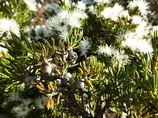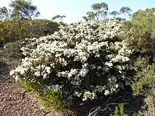 The flowers are white and arranged in heads or spikes on the ends of branches which continue to grow after flowering and sometimes in the upper leaf axils. Each head or spike contains 3 to 9 individual flowers and is up to 20 mm (0.8 in) in diameter. The stamens are arranged in five bundles around the flowers and there are 12 to 16 stamens per bundle. The main flowering period is from September to January and is followed by fruit which are woody capsules 4–5.5 mm (0.16–0.22 in) long.[2][3]