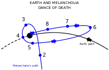 A dream sequence showcases slow-motion shots of the main characters, a collapsing horse, falling birds, butterflies, different planets, and images of the Earth colliding with a rogue planet.[9]