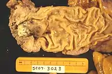 Gross pathology of melanoma metastasis, which is pigment-forming in a vast majority of cases, giving it a dark appearance.